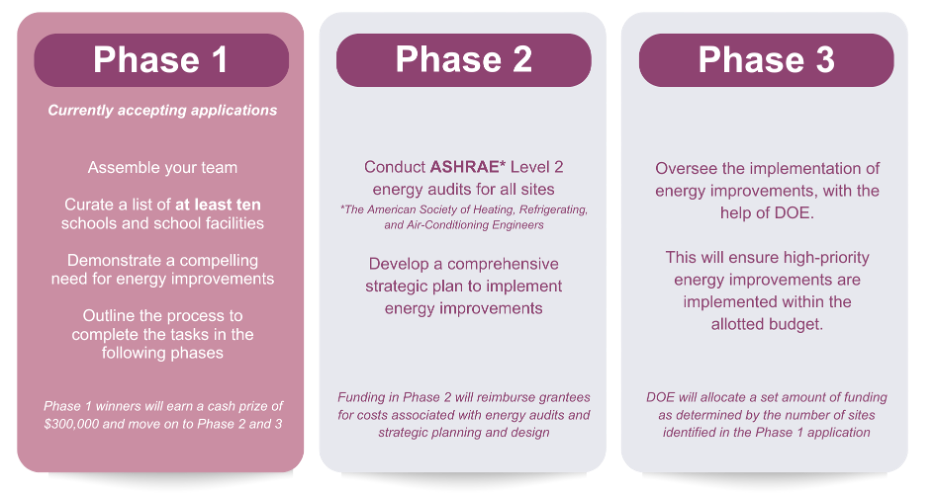 Applications are now open for the second round of funding and are due on June 13, 2024! This year, the Renew America’s Schools Prize presents a three-phase opportunity to help districts build capacity, perform energy audits, and implement energy improvement projects across a portfolio of school facilities.
